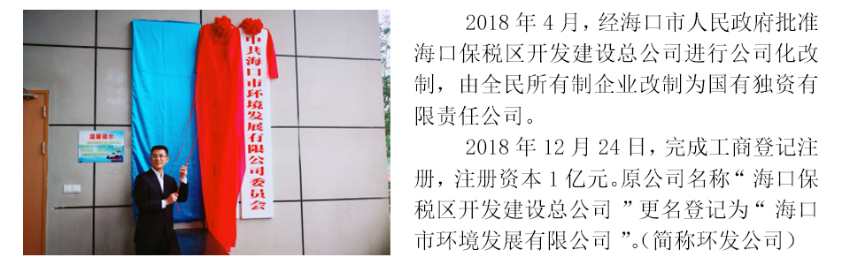 ??谑协h(huán)境發(fā)展有限公司是海口市屬?lài)?guó)有獨(dú)資有限責(zé)任公司,于2018年12月正式掛牌運(yùn)營(yíng),注冊(cè)資本1億元,由1993年12月成立的??诒6悈^(qū)開(kāi)發(fā)建設(shè)總公司進(jìn)行公司化改制而成,核心業(yè)務(wù)為環(huán)境環(huán)衛(wèi)產(chǎn)業(yè)投資和運(yùn)營(yíng)、資產(chǎn)運(yùn)營(yíng)和管理,培育業(yè)務(wù)為工程管理